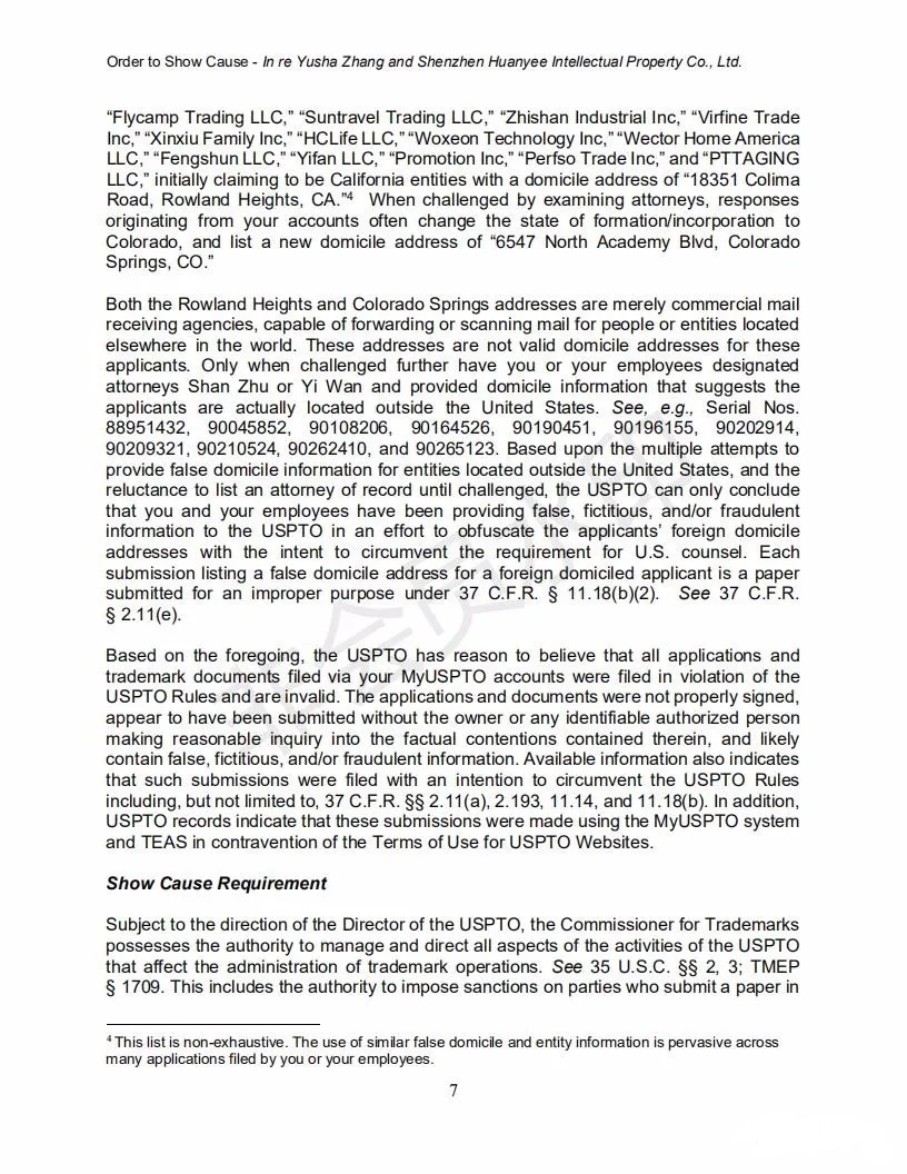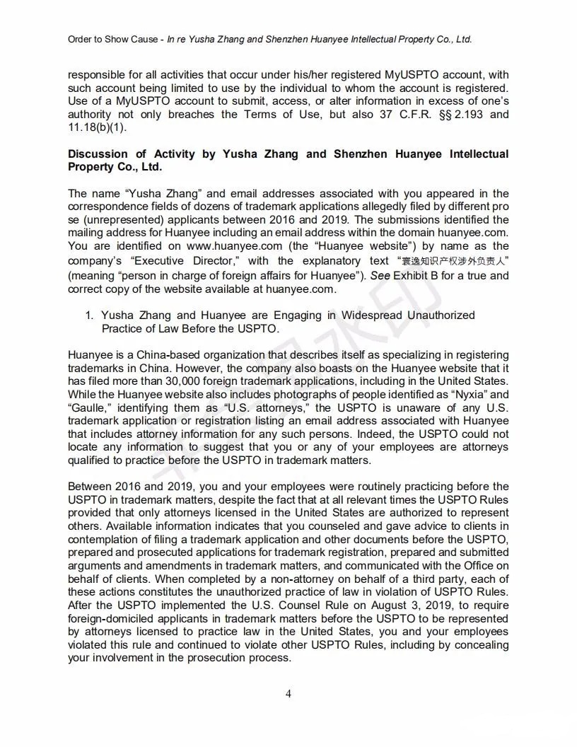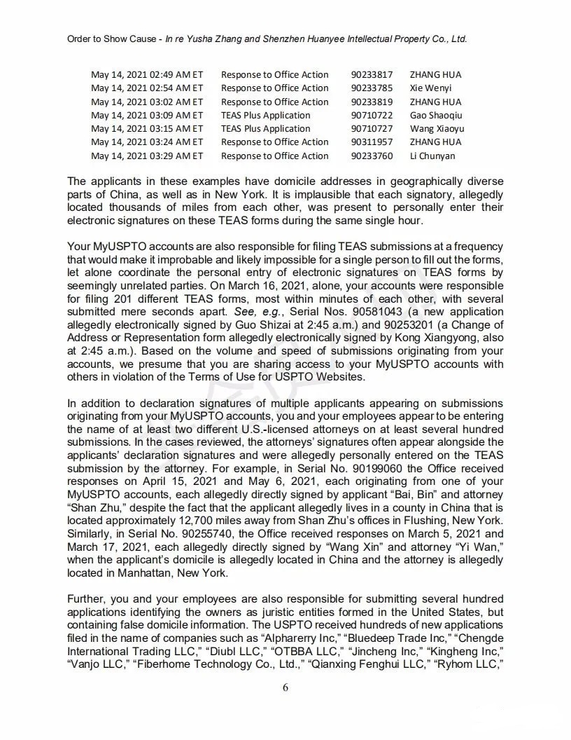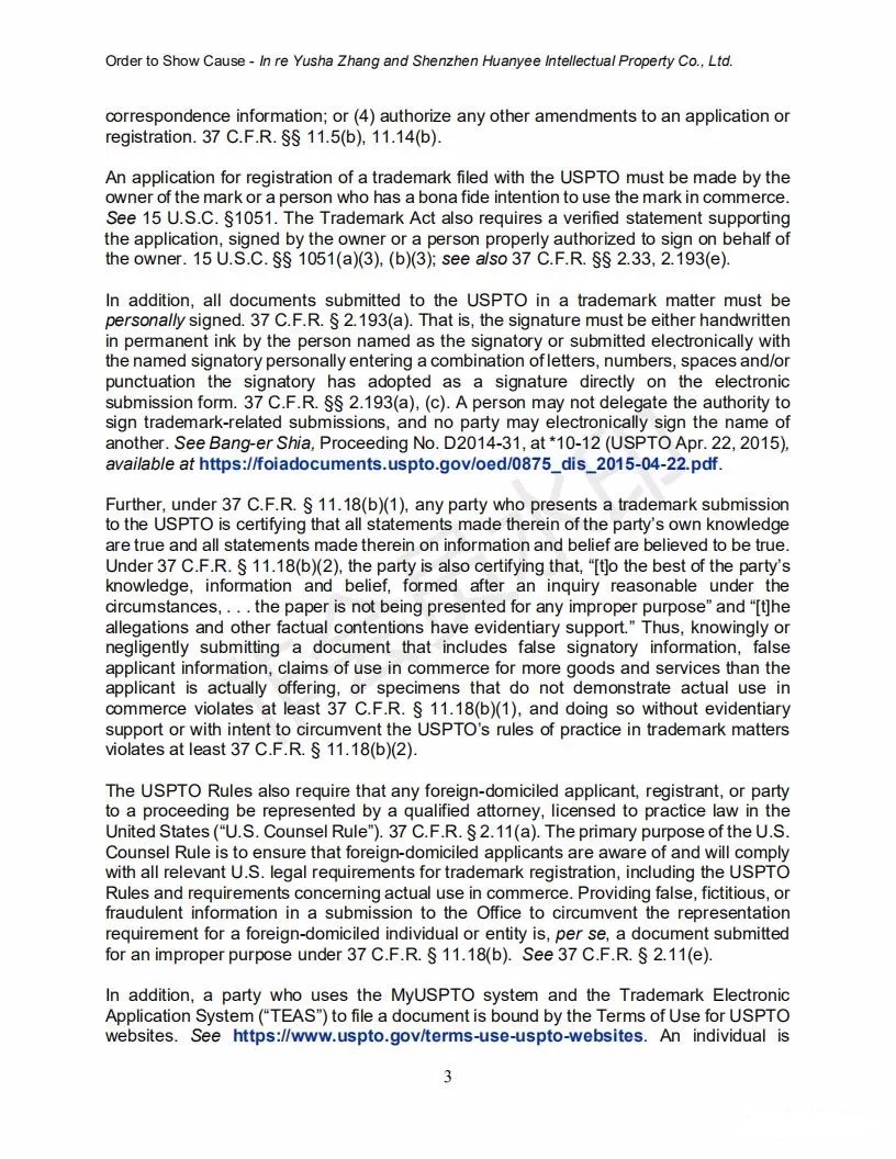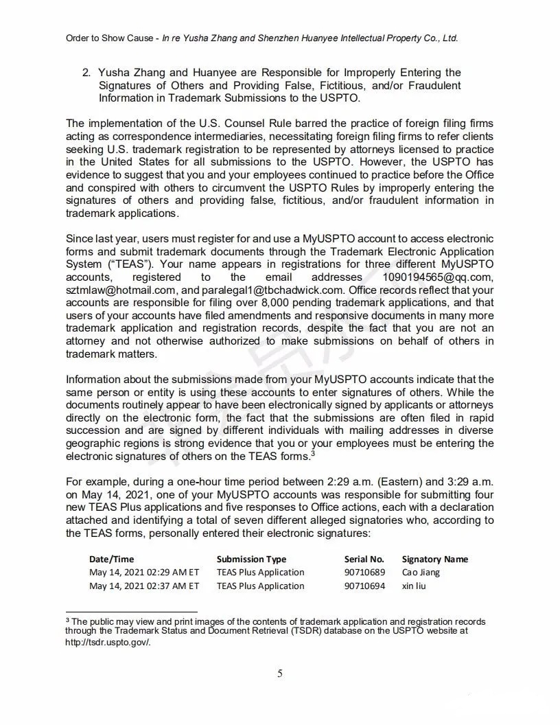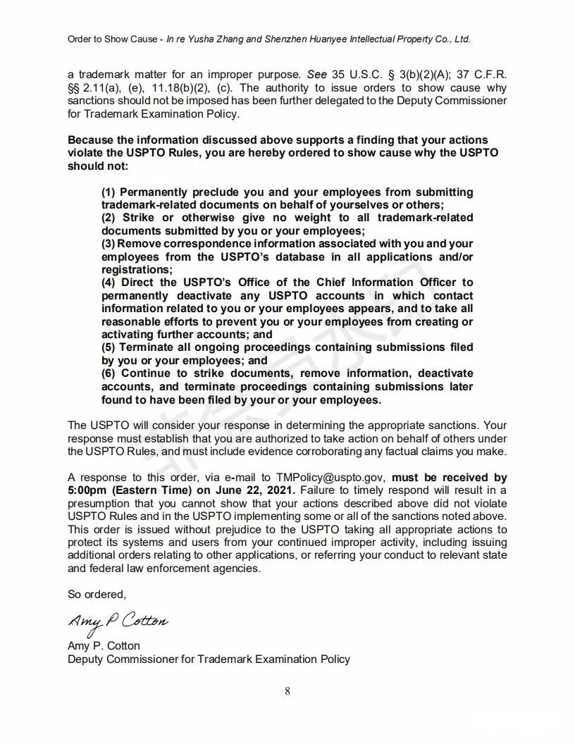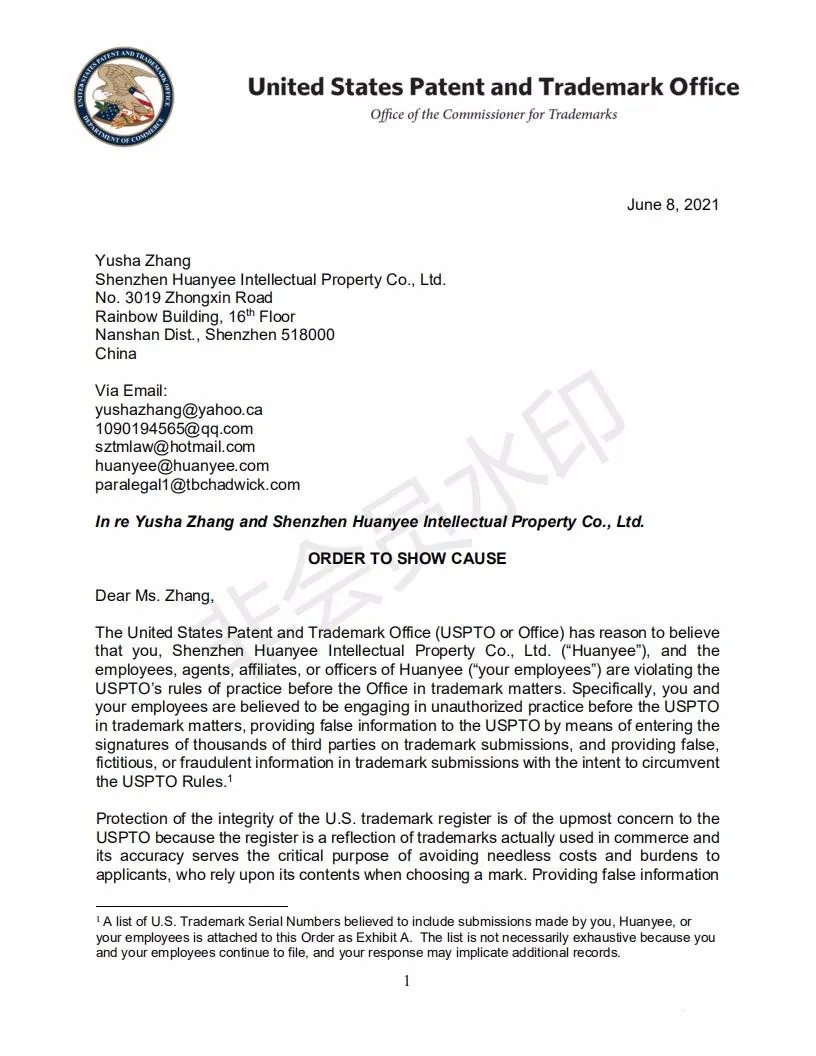 2021年6月8日,美國專利商標局(USPTO)向中國深圳一家知識產權公司的代表人發出一份123頁的“ORDER TO SHOW CAUSE”。對該公司代理提交的批量美國商標的行為,尤其是其中涉及到第三方簽名提供虛假、虛構和欺詐信息的行為提出質疑,要求該公司提出合理的理由,并在美國東部時間6月22日下午5:00前進行回復。否則USPTO將會對該代理機構以及代表人進行制裁。