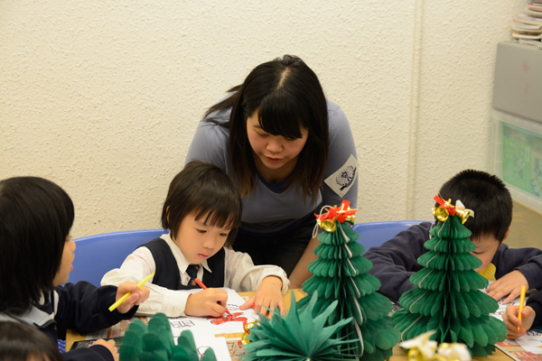 我們教小朋友制作、剪裁并鼓勵(lì)小朋友自己發(fā)揮創(chuàng)意設(shè)計(jì)圣誕樹(shù)的造型,大家坐在一起動(dòng)手制作創(chuàng)意圣誕樹(shù),不時(shí)傳出的談笑聲讓整個(gè)課室的氣氛非常溫馨。
