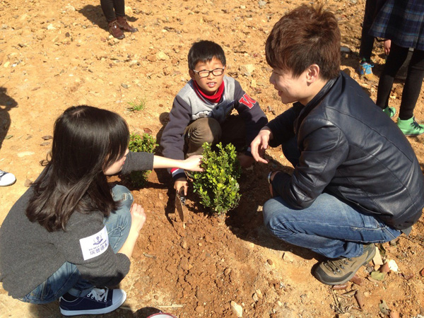 來到目的地,大家挖土的挖土,澆水的澆水,分工明確,合作協調。不一會,一顆顆小樹苗便已經在這片荒蕪的土地上安了家,大伙看著這一顆顆幼小的生命,都露出了會心的微笑。