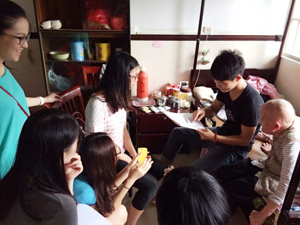 婆婆叮囑我們,年輕人要多運(yùn)動(dòng),注意休息保護(hù)好自己的眼睛。還跟我們分享年輕時(shí)候生活的艱辛,婆婆的活潑開朗使氣氛都活躍起來,她告訴我們要時(shí)刻保持樂觀愉快的心情,年紀(jì)雖然大,但是心態(tài)要年輕,還要每天堅(jiān)持讀報(bào)。