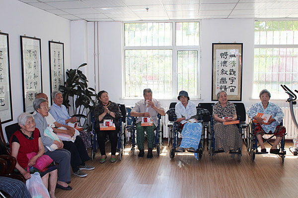 我們在干凈明亮的活動室里見到老人們,送上了我們精心準備的毛毯、護腰和水杯等禮物。禮物雖輕但是卻帶去我們對老人們的關懷之情。