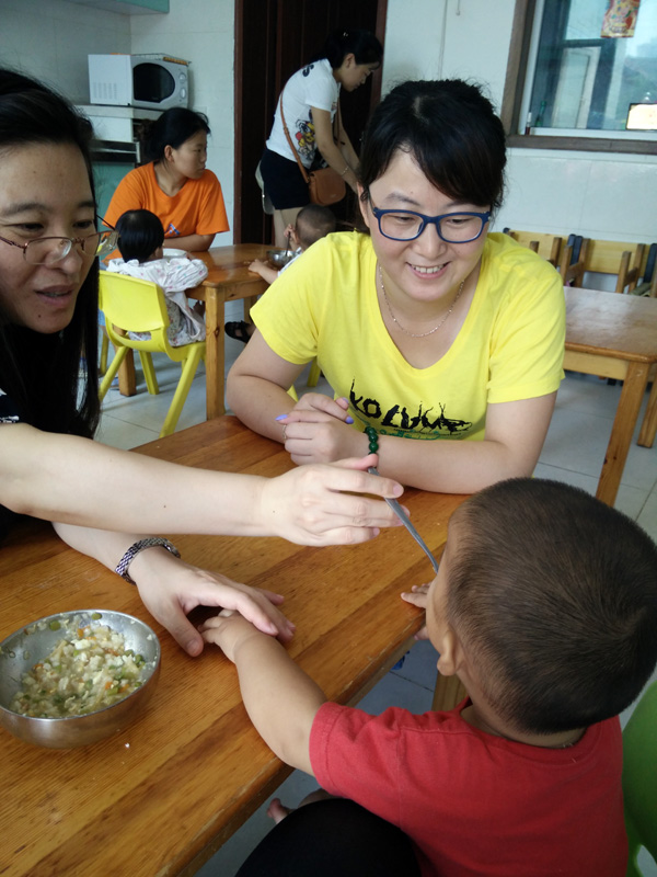 很快到了吃飯的時間,工作人員說這里吃飯是分批的,優先給不能獨立吃飯的孩子們喂飯,其次才是能獨立吃飯的孩子。工作人員人手不夠我們自然也加入到了喂飯的隊伍,看著孩子們吃的開心我們的心里也是滿滿的幸福。